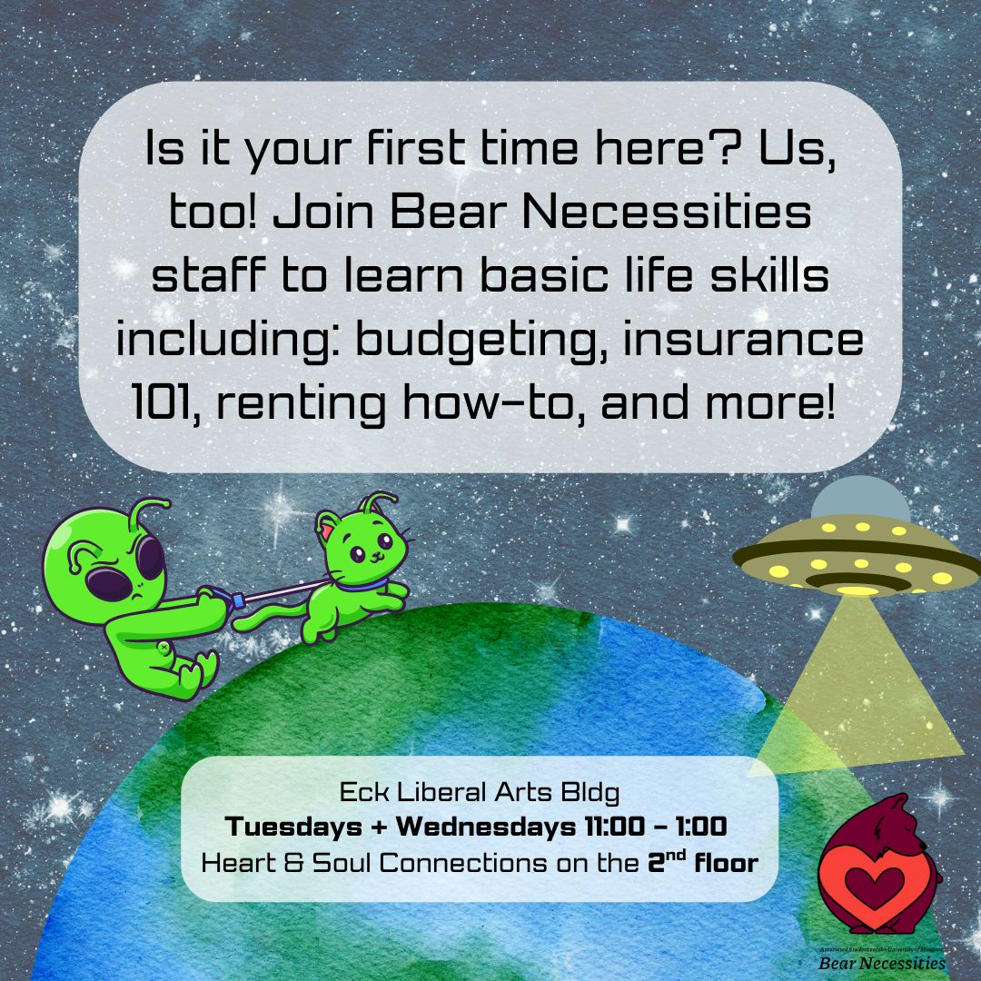 The Bear Necessities team is excited to roll out new programming focused on supporting students in learning basic skills for independent adult life. Students can find us in the Heart & Soul Connections space on the second floor of the Eck Liberal Arts Building on Tuesdays and Wednesdays from 11:00 - 1:00 all semester for this rotating series.